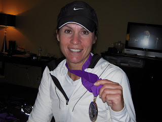 Since we didn’t have a camera at the race, here is a picture of me after we got back to the hotel. It had been a cold race, so you can see my lips are still purple.