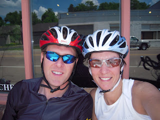 Today, Mike took me on a bike ride from our house to Watertown, a little town about 15 miles away. The entire route is perfect for riding with big wide shoulders and only a few stops. Mike uses this route quite a bit for training, but the ride was new for me. It was a great ride! Here we are after we got to Watertown and had a little hydration. Then it was back on the bikes to head home.