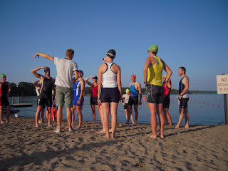 Sarah, right away. It was so great to meet them. Thanks to both of them for all of their warm smiles and encouragement! I got in the water and got acclimated while everyone got ready. There were 16 of us and it was very casual. I stayed back and got in the water last because I knew I would be slow. The water was pretty shallow so I actually walked out quite a bit. The transition for the run was fun because it was so quick. I rinsed my feet, pulled on my shoes and I was off. Before I knew it, the first heat was over with. Although I clocked the slowest run time with a 8:52 mile, I actually came in ahead of two other women. Of course, one woman had shown up late and got in the water after I had already completed a lap, and the other woman had never open water swam before. Still, I thought I did okay.